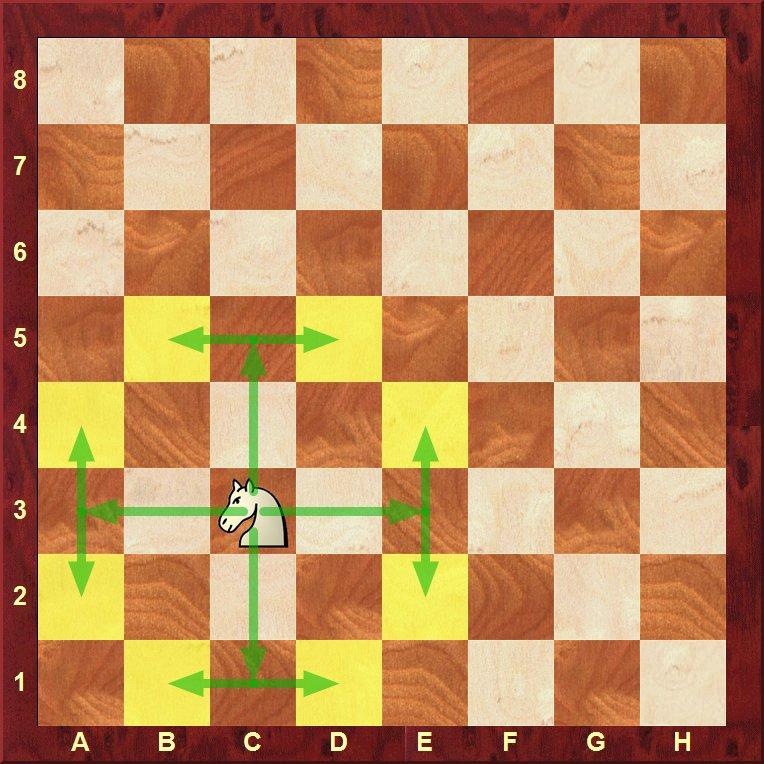 Le Cavalier se déplace en formant un L, à partir de la case où il se trouve. On peut dire qu'il se déplace d'une case comme une Tour et d'une case comme un Fou. Les cases jaunes représentent celles où peut aller le cavalier blanc c3. Celui-ci peut sauter par dessus les pièces.